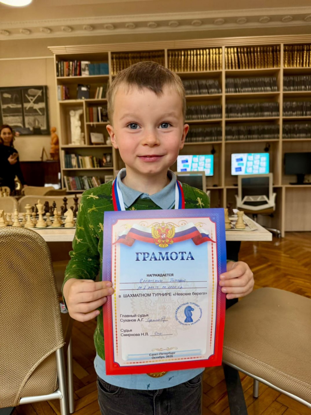 🍁 Турнир Невские берега 2018 и младше посетил ♟ Тимофей Саласский. ❗6-е место из 24 участников очень хороший результат для парня 2020 г.р. И, разумеется, бонусом приз за Чемпионство в категории 2019-2020. Молодец, Тимофей!